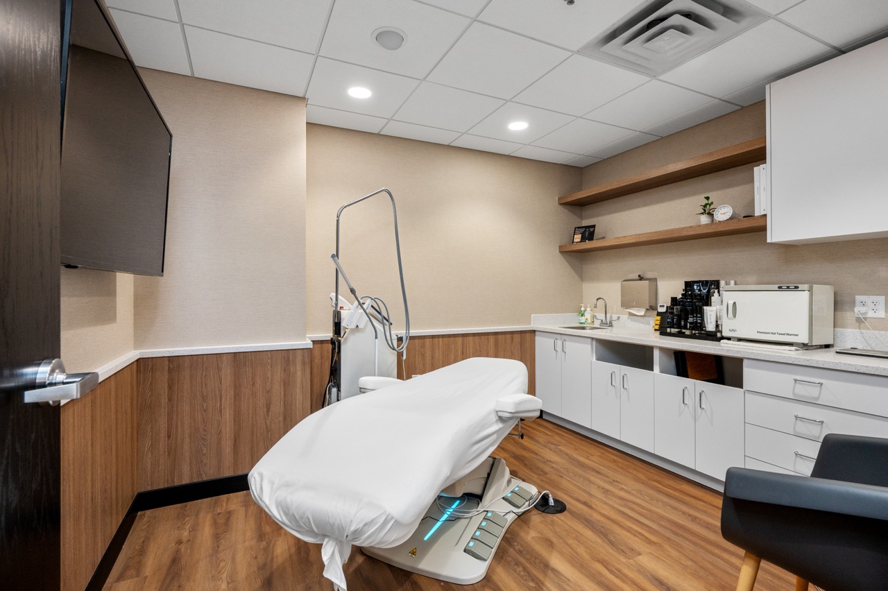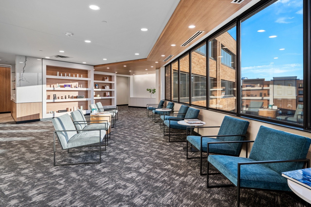 Starting with assembling a highly qualified team, EFH brought in designers and architects to make the new clinic a modern showcase for Lakes Dermatology, doubling their patient capacity as well. This project was unique in addressing the challenges of the pandemic, keeping the clinic open for business while completing the construction and maintaining our consistently high standards to address all necessary sanitation and cleanliness protocols. The entrance received a new glass vestibule with large windows, leading customers into an expansive reception area with glass shelving and a one-of-a-kind reception desk constructed using Italian large format tile. In addition, the existing clinic was completely updated providing large employee areas, new flooring, and acoustical solutions to address patient privacy.
